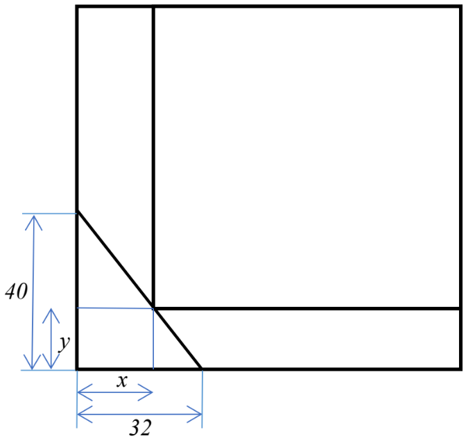 Un espill pla, quadrat, de 80 cm de costat, s’ha trencat per un cantó seguint una línia recta. El tros desprès té forma de triangle rectangle de catets 32 cm i 40 cm respectivament. En l’espill trencat retallem una peça rectangular R, un dels vèrtexs de la qual és el punt (x,y) (vegeu la figura).